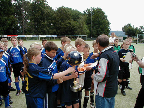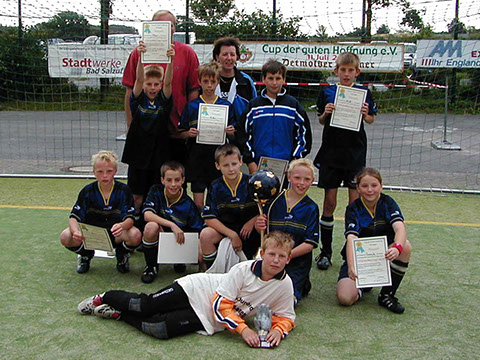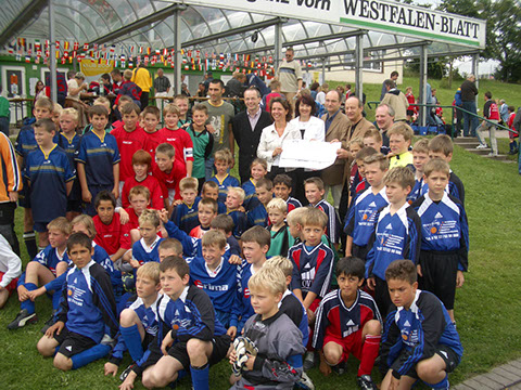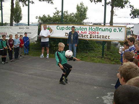 Die dritte Austragung eines E-Jugendturniers zugunsten krebskranker Kinder hatte sich für alle Beteiligten so richtig gelohnt. Die Kicker des TuS Lockhausen freuten sich über ihren Pokalgewinn im 1:0 Endspielsieg gegen Gastgeber TuS Ahmsen, die übrigen Kinder über die obligatorischen Urkunden und der Cup der guten Hoffnung verzeichnete eine Rekordeinnahme für den guten Zweck von letztendlich über mehr als 4.000 Euro. Da konnte man es schon verschmerzen, dass der als Top-Stargast angekündigte ehemalige Bundesligaprofi und Europameister Stefan Kunz leider doch nicht erschienen war. Um so mehr freute man sich über die Präsenz eines anderen Ex-Profis: Thomas Stratos! Dieser beschäftigte sich viel mit den Jugendlichen und bewies sein Können beim "Ballhochhalten". Die Kiddies eiferten ihm begeistert nach; doch seine Bestmarke blieb natürlich unerreicht. Abgerundet wurde das Programm neben dem sportlichen Teil mit einer tollen Tombola, dem Zauberer Siggi Socke und Tanzeinlagen der Mädchentruppe des TuS Ahmsen. Der stolze Spendenbetrag kam übrigens durch die Stadtwerke Messepartner, die Turniereinnahmen und sonstige Spenden zustande. Die Stadtwerkeeinrichtungen aus Bielefeld, Lemgo, Detmold und Bad Salzuflen hatten im Frühjahr bei der Messe "Haus" zusammen mit der RWE einen Messestand; gespendet wurden jetzt Einnahmen vom Pickertessen der lippischen Landfrauen, stolze 2.160 Euro. Diesmal soll der Betrag in die Zimmerausstattung (Kinderspielzimmer) fließen.